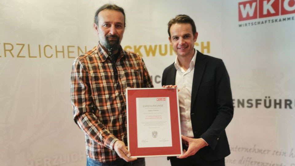 Ovo priznanje uručio mu je predsjednik Pokrajinske obrtničke komore Koruške (Austrija), Franz Ahm, čime je dodatno potvrdio njegov dugogodišnji rad, trud i uspjeh u austrijskom poslovnom okruženju.
